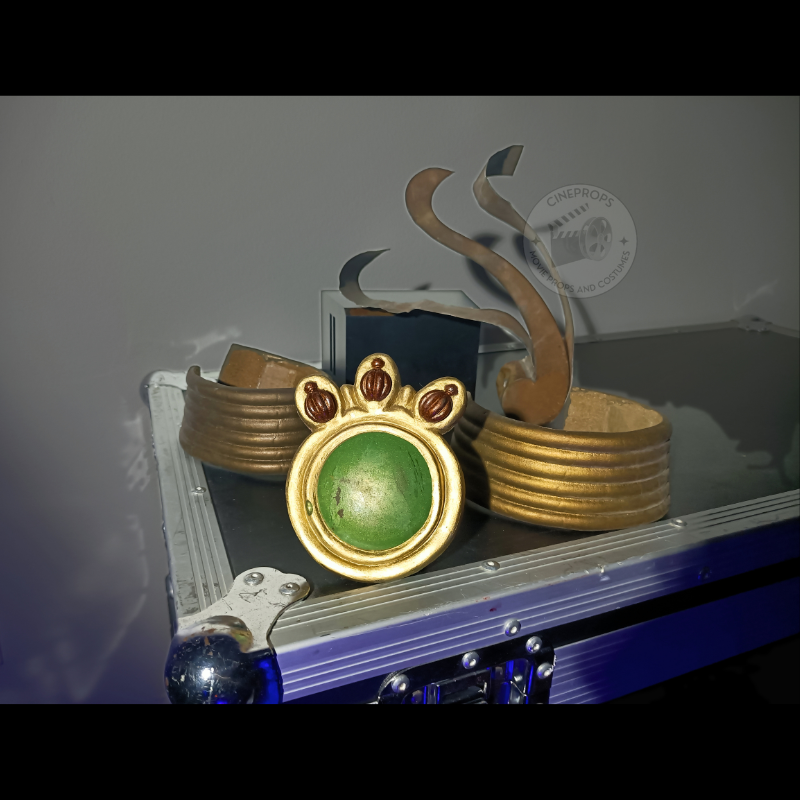 Ces pièces ornementales en résine peinte et patinée, au style tribal et reptilien, étaient fixées aux tenues des mystérieux hommes serpent, serviteurs de Thulsa Doom. Chaque accessoire présente des détails sculptés à la main, avec une finition vieillie et texturée, propre à l’esthétique mythologique du film. Ces accessoires sont fabriqués en mousse de latex (bracelets), en résine et en métal (ornement).  Un morceau de l’âge hyborien à exposer fièrement dans toute collection dédiée à l’heroic fantasy ou au cinéma des années 80.