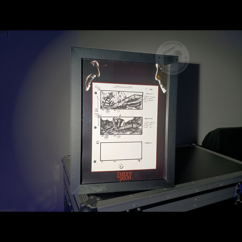 Cette planche de storyboard illustre une séquence clé opposant les deux icônes du cinéma d’horreur. Réalisée pour guider les équipes caméra, effets spéciaux et cascades, elle dévoile le découpage visuel précis nécessaire pour chorégrapher ces affrontements mêlant monstres, cauchemars et atmosphères macabres. Les annotations de production témoignant des ajustements techniques apportent un aperçu rare du processus créatif derrière ce crossover devenu culte.